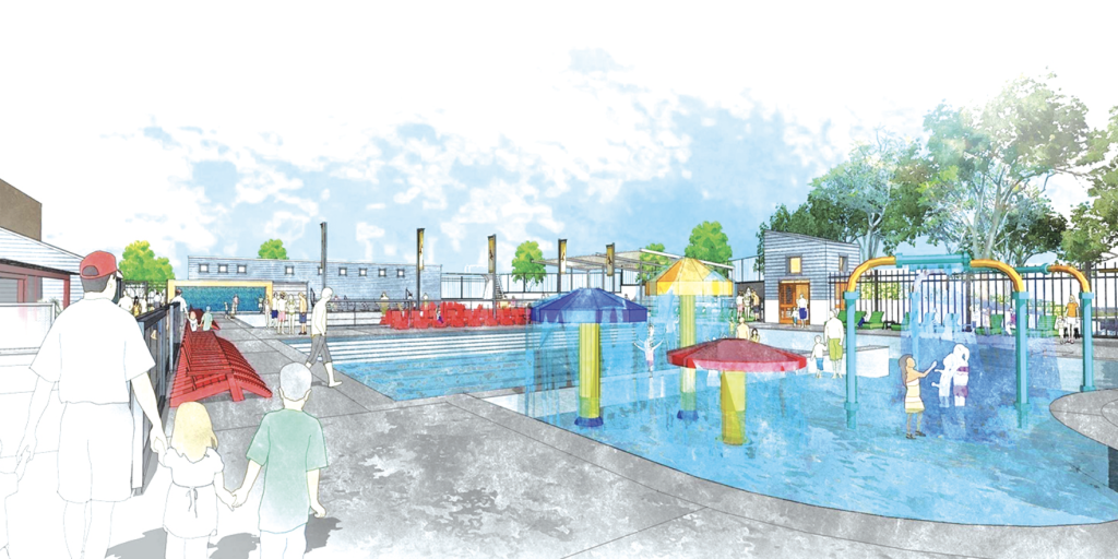 NEW POOL AND COMMUNITY CENTER: (top) artist’s rendition of the new Smith Park Aquatic Center, a sprawling complex to be completed in the summer of 2025. Amenities will include two 25 meter pools, zero-entry pool for kids and seniors, diving board at the appropriate pool depth; stadium seating for parents and others to use during events and competitions, as well as family-friendly seating areas for casual use and a small water-park type recreation area (above) for families