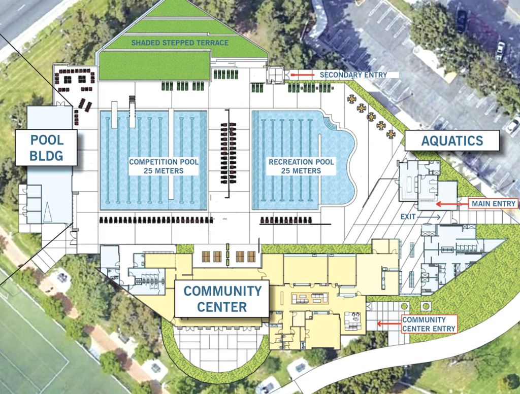 Other amenities will include a diving board at the appropriate pool depth; stadium seating for parents and others to use during events and competitions, as well as family-friendly seating areas for casual use; new fencing and security for the pool enclosure, with efficient lighting and camera monitoring system and new chemical, heating, and pumping systems.
