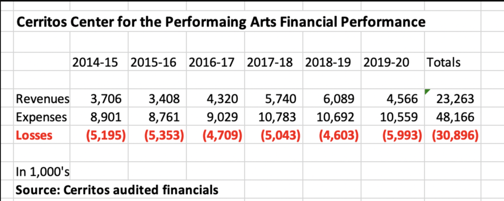 According to the city’s audited financials, the highest revenue year in the history of the theater hit $6.089 million in 2018-2019; in Barrows’ proposed budget, a 21% increase in expenses amounts to $1.7 million for a total of $9.6 million meaning sales must increase 57% over ’18-’19 for the theater to break-even.