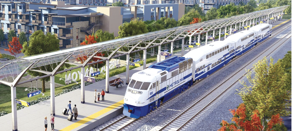 ARTIST’S RENDITION of one possible station configuration for Pico Rivera’s commuter rail station to be located near Paramount Blvd. and the L.A. to Anaheim rail corridor.