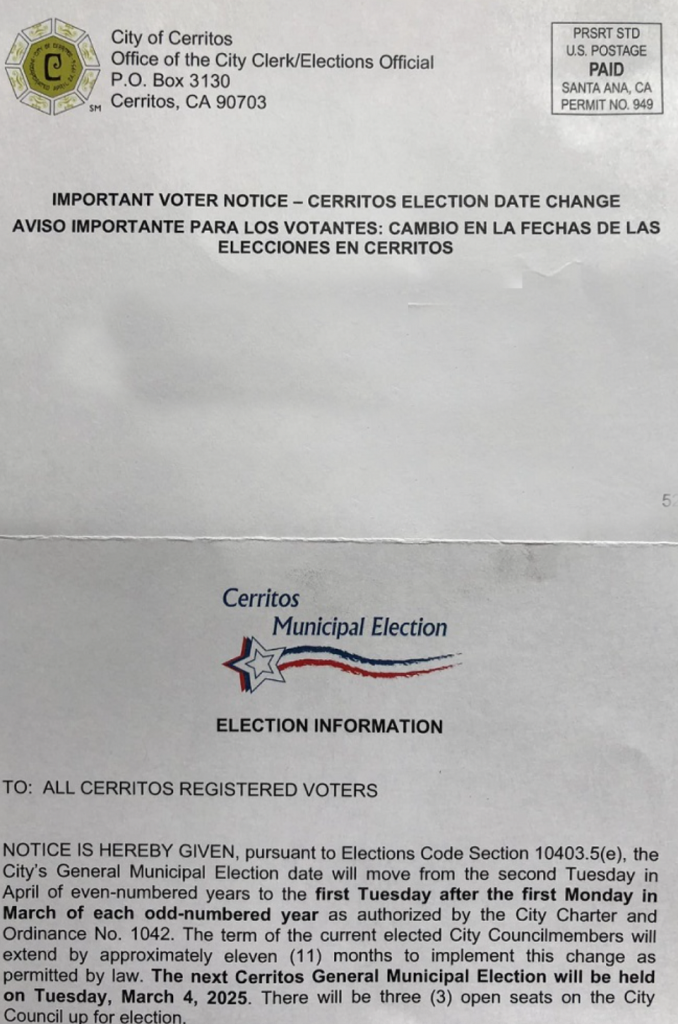 Last week, Cerritos residents received an “important voter notice” in the mail regarding the controversial Cerritos election date change the City Council recently approved 3 to 2, moving the election from 2024 to 2025 and adding another year to all elected official’s terms.