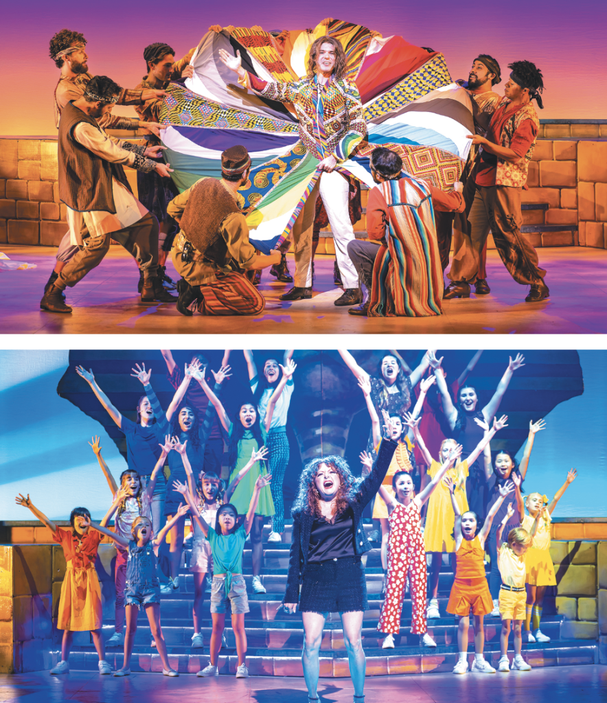 CHRIS MCCARRELL (top center) with the company in Joseph and the Amazing Technicolor Dreamcoat. Kelli Rabke (bottom, center) and the “Children’s Choir.”