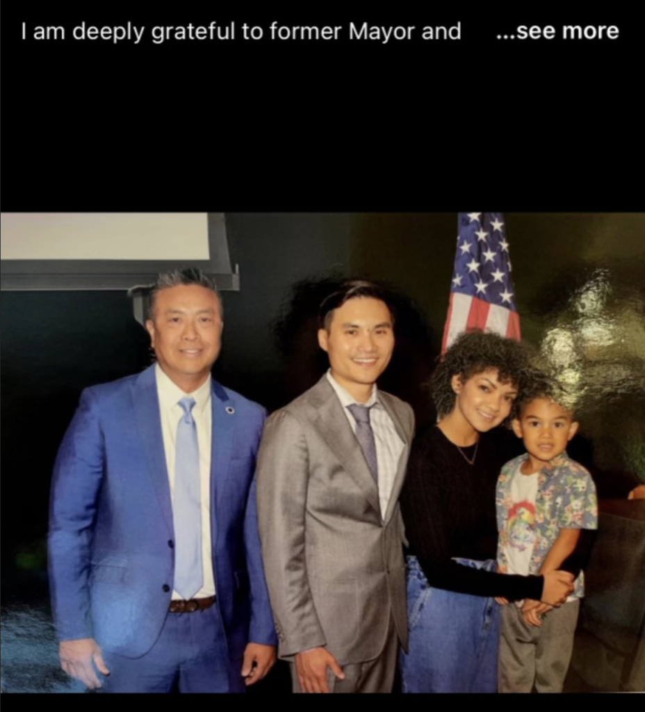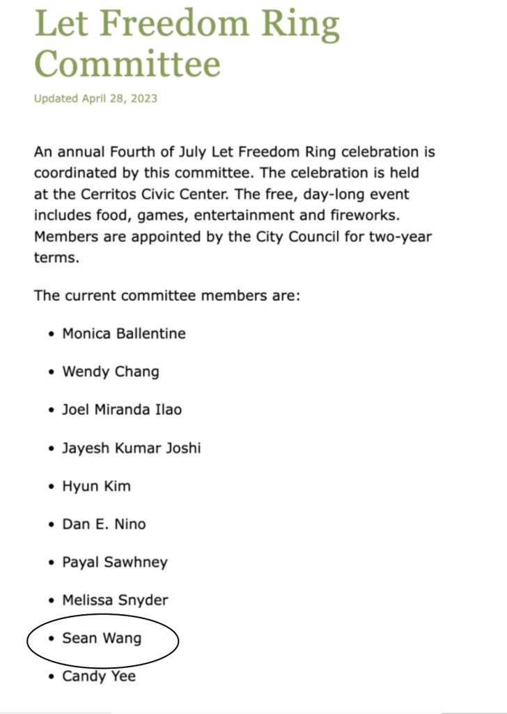 Yet a check of Cerritos’ website shows Wang is on the city’s Let Freedom Ring Committee, appointed by Cerritos Councilman Chuong Vo a BFF of Brad Beach; Wang also proudly proclaims he lives in Cerritos and is on the LFR Committee.