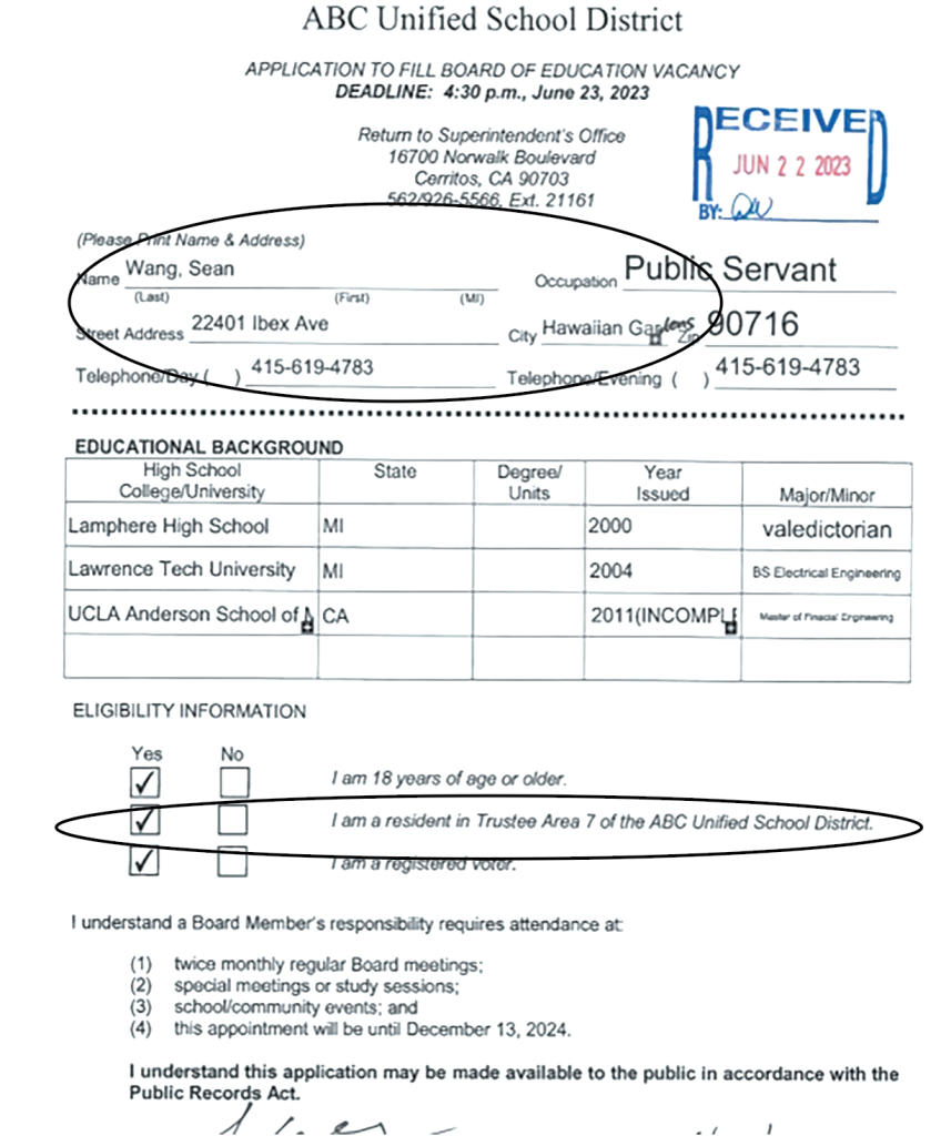 THERE IN BLACK AND WHITE: The ABC Unified School District Application to Fill Board of Education Agency filled out by Cerritos Councilman Chong Vo’s LFR Committee appointee Sean Wang showing a reported address in Hawaiian Gardens; Wang also checked the box that he was a resident of Trustee Area Seven. To be on the LFR Committee Wang must be a Cerritos resident.