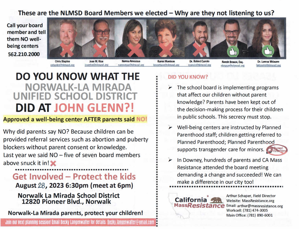 The flyer called for parents to attend the Aug. 28 NLMUSD meeting to protest a board decision that established a Wellbeing Center at John Glenn High.