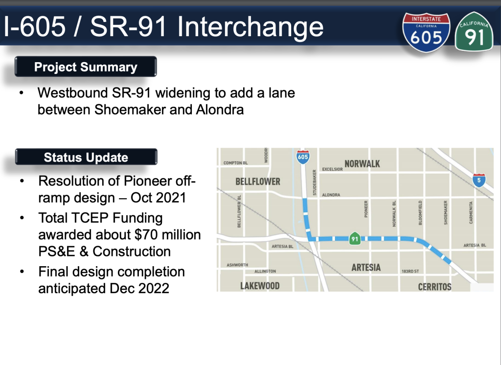 The 91 Freeway expansion project includes widening the westbound 91 in Artesia and Cerritos, adding one additional lane for nearly four miles between Shoemaker Avenue and the 605 Freeway exit at Alondra Boulevard.