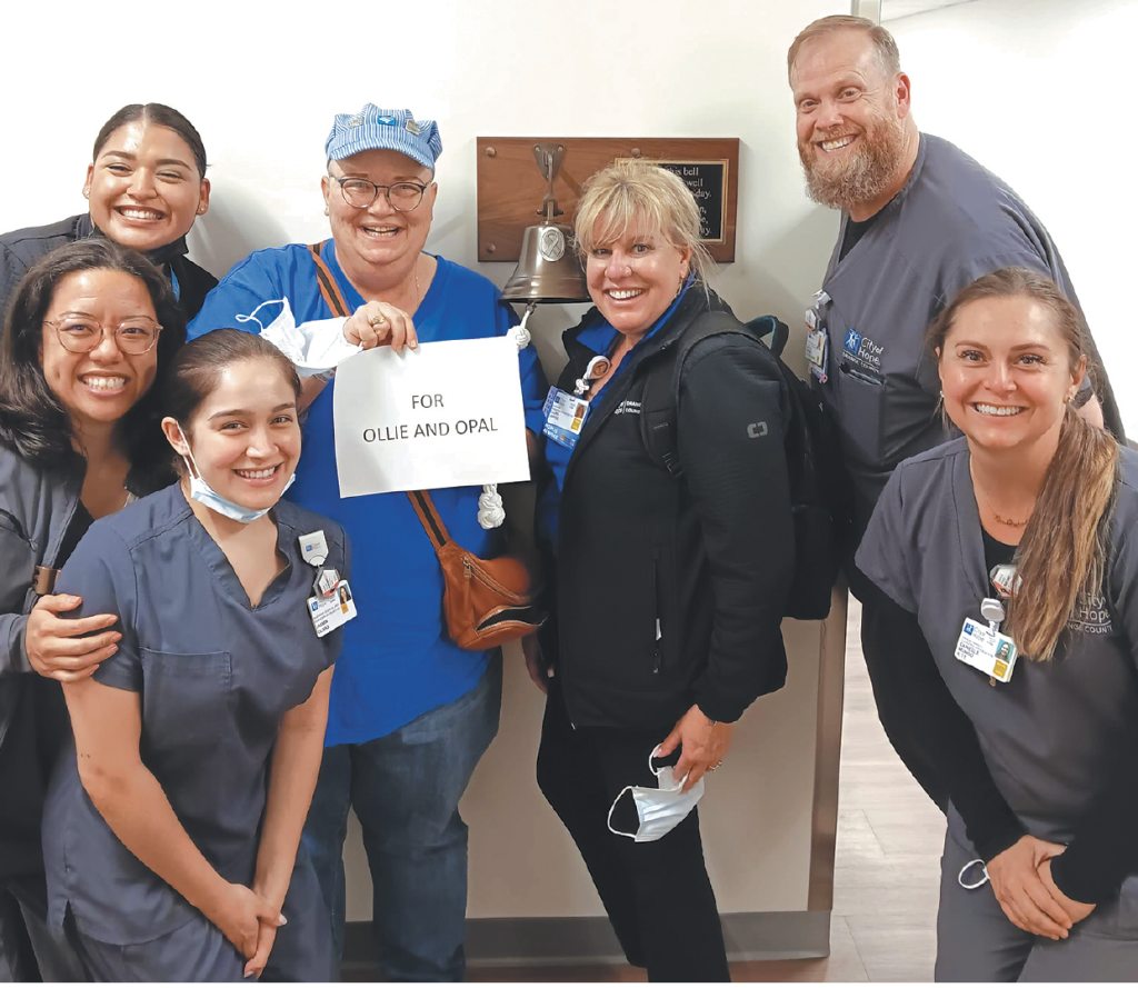 LCCN JOURNALIST Laurie Hanson with her blue engineers hat ringing the bell upon completion of all her cancer treatments including chemo and radiation therapies. With her is the Radiation Oncology personnel at City of Hope in Irvine.