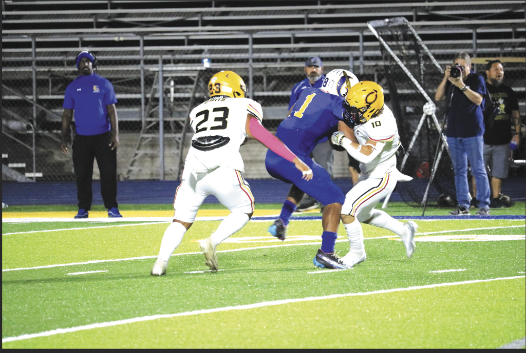 CERRITOS HIGH junior linebacker Devyn Chantha (#23) and senior cornerback Ruben Ligorria stop Gahr High senior running back Kalen Montgomery in last Friday’s city rivalry game. Gahr defeated Cerritos 27-20 as Montgomery rushed 12 times for 90 yards and scored the tying touchdown early in the fourth quarter.PHOTO BY ROXY LIGORRIA.