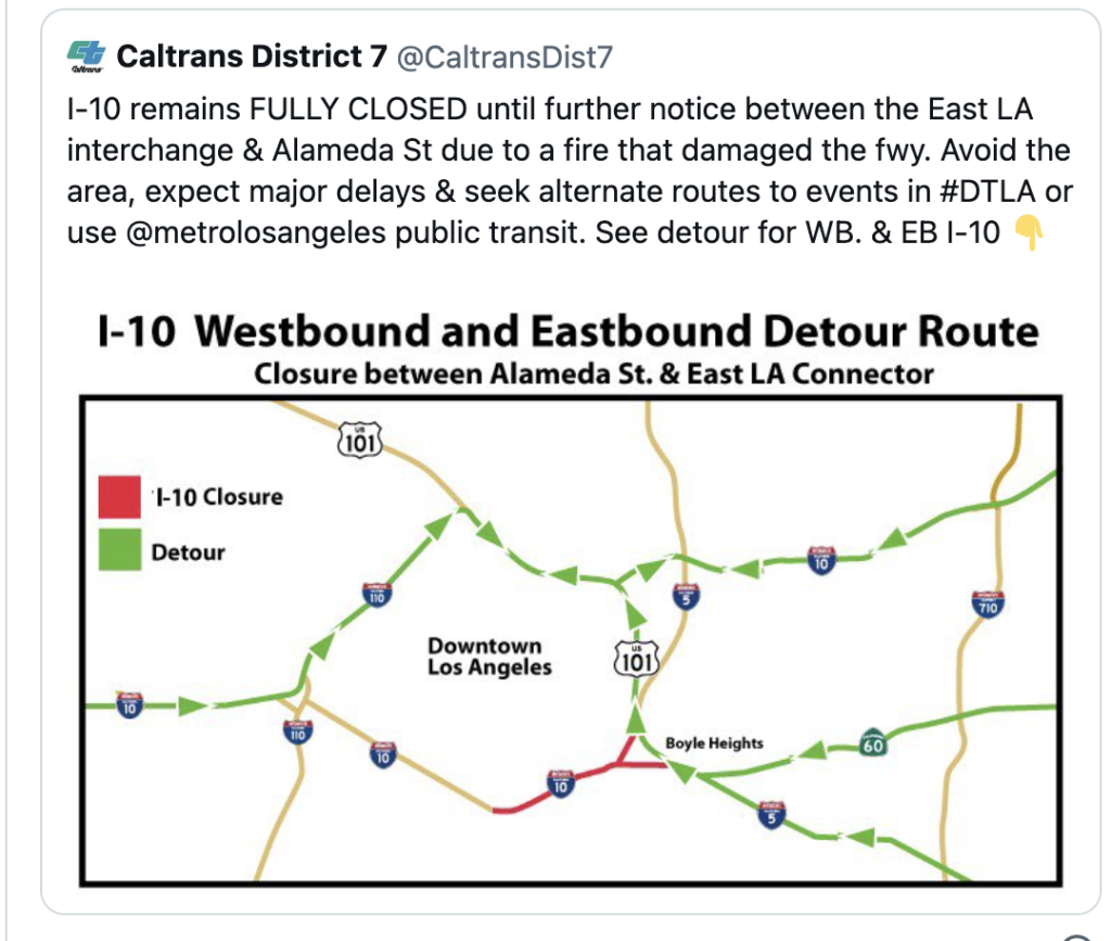 As a stretch of the 10 Freeway in downtown Los Angeles remained closed in the aftermath of a fire that erupted under the interstate, officials announced detours and transit alternatives while commuters braced for a Monday morning traffic nightmare in the area.