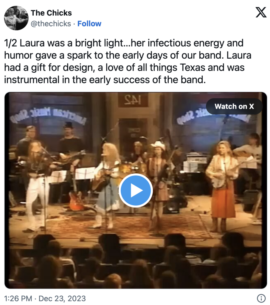 Laura Lynch, a founding member of The Dixie Chicks, was killed in a head-on crash in Texas, authorities confirmed Saturday. She was 65.