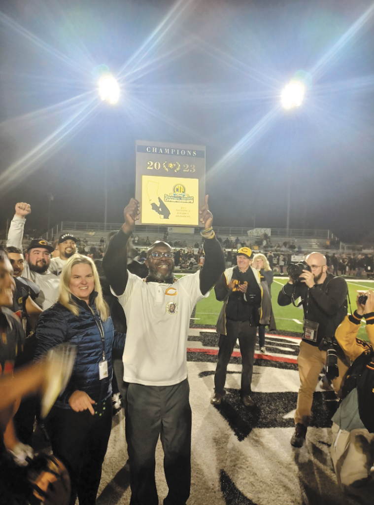 Cerritos High first-year head coach Demel Franklin celebrates with his team the school’s first CIF-Southern Section divisional title in the sport, a 19-13 overtime win over Yucca Valley High on Nov. 25. PHOTO BY LOREN KOPFF.