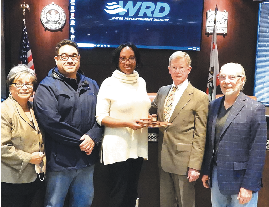 TRANSITION: President John Allen passes the gavel to newly elected WRD Board President Joy Langford during WRD’s Board Reorganization. In addition, Director Rob Katherman (far right) was appointed to Vice President, Director Vera DeWitt (far left) as Secretary, and Sergio Calderon (second from left) as Treasurer.