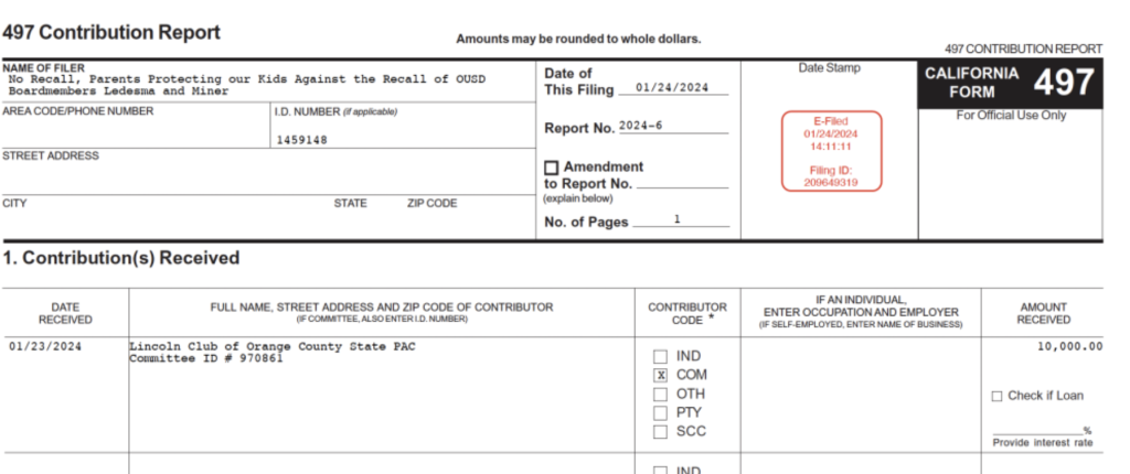 Records show that on January 23, 2024, three days after the first January reporting period, the Lincoln Club donated $10,000 to No Recall; the Club’s donations now totaled $40,500.