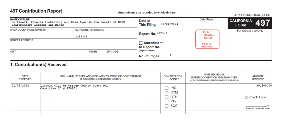 An eye-opening $30,500, 78 percent, was donated by the Lincoln Club of Orange County State PAC. The average age of a Lincoln Club member is 60 years old, but here was the Club donating big money to a local school district recall.