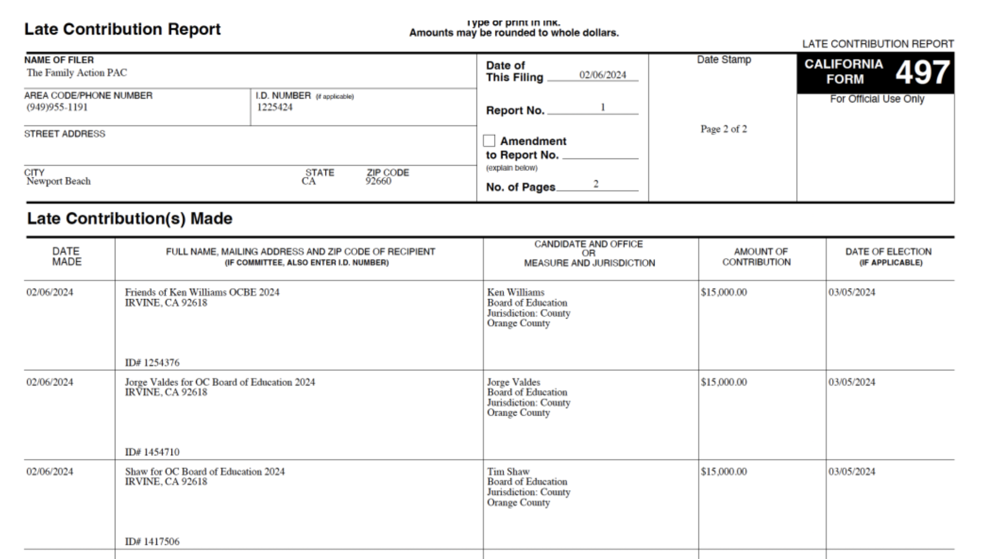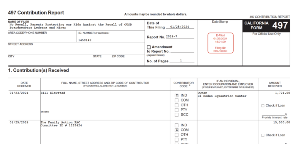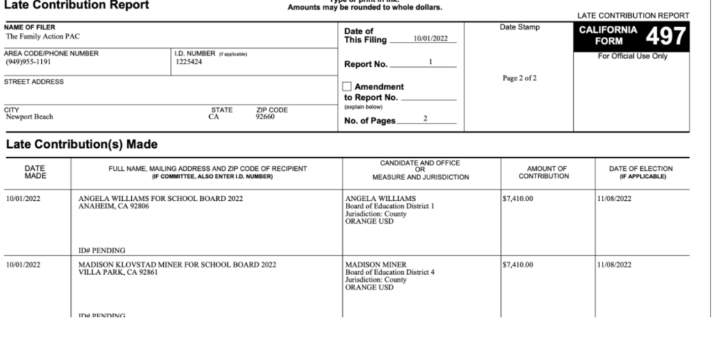 In addition, just yesterday, on February 6, the Family PAC took in another $45,000 from three current Orange County Board of Education Board Members: 1st District Trustee Jorge Valdes, 2nd District Trustee Mari Barke, and 4th District Trustee Tim Shaw donated $15,000 each from their respective campaign committees.