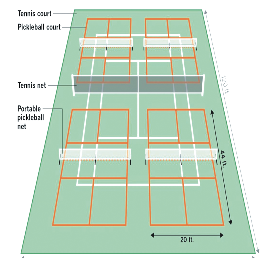 CONVERSION: A tennis court converted into four Pickleball courts. The surface of the tennis court in this case is 120 ft. x 60 ft. Pickleball courts are 44 ft. x 20 ft. with much different stripes compared to a tennis court.The stripes can cause confusion but most people only complain if the stripes are tape which can cause funny bounces.