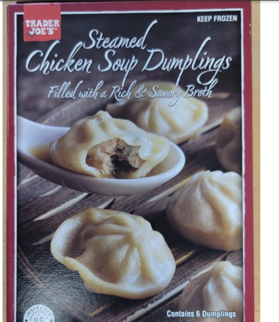 - 6-oz. boxes with plastic trays containing six pieces of “TRADER JOE’S Steamed Chicken Soup Dumplings” with lot codes “03.07.25.C1-1” and “03.07.25.C1-2” printed on the side of the box.