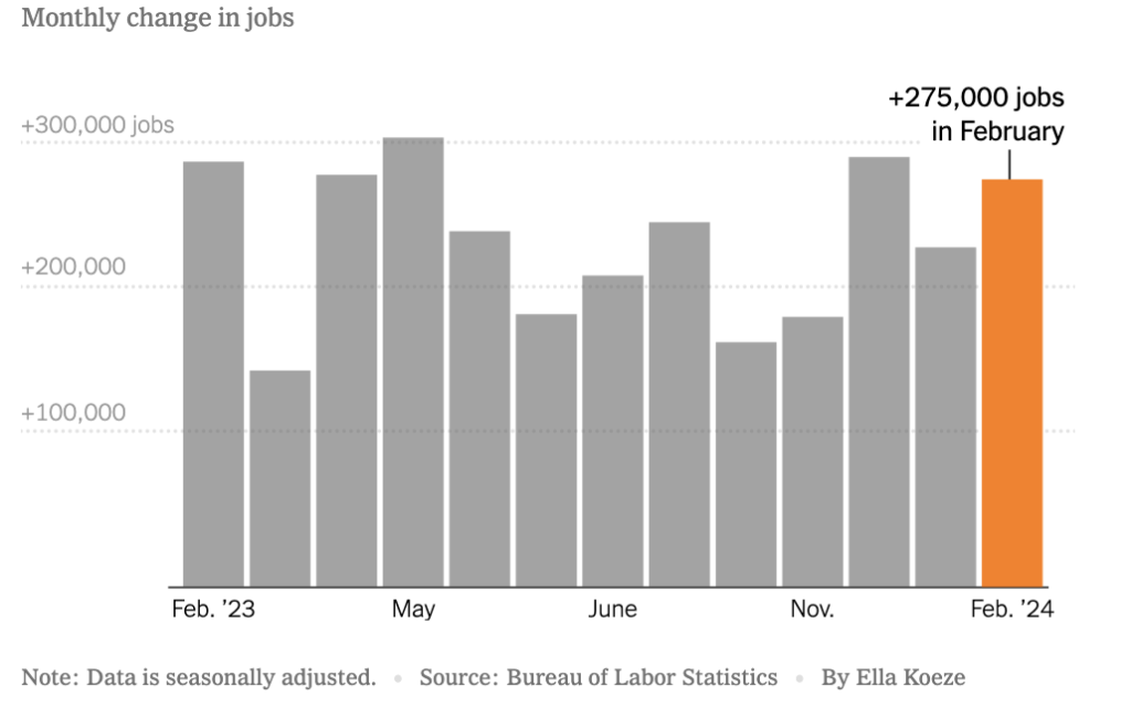 The labor market showed resiliency in February, adding 275,000 jobs, a sign that economic growth is still solid.