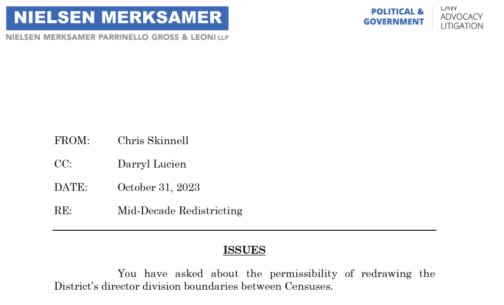 The memo was written by a prominent law firm in the redistricting arena, Sacramento-based Nielsen Merksamer, which was involved in the 2022 CB redistricting process after the 2020 census.