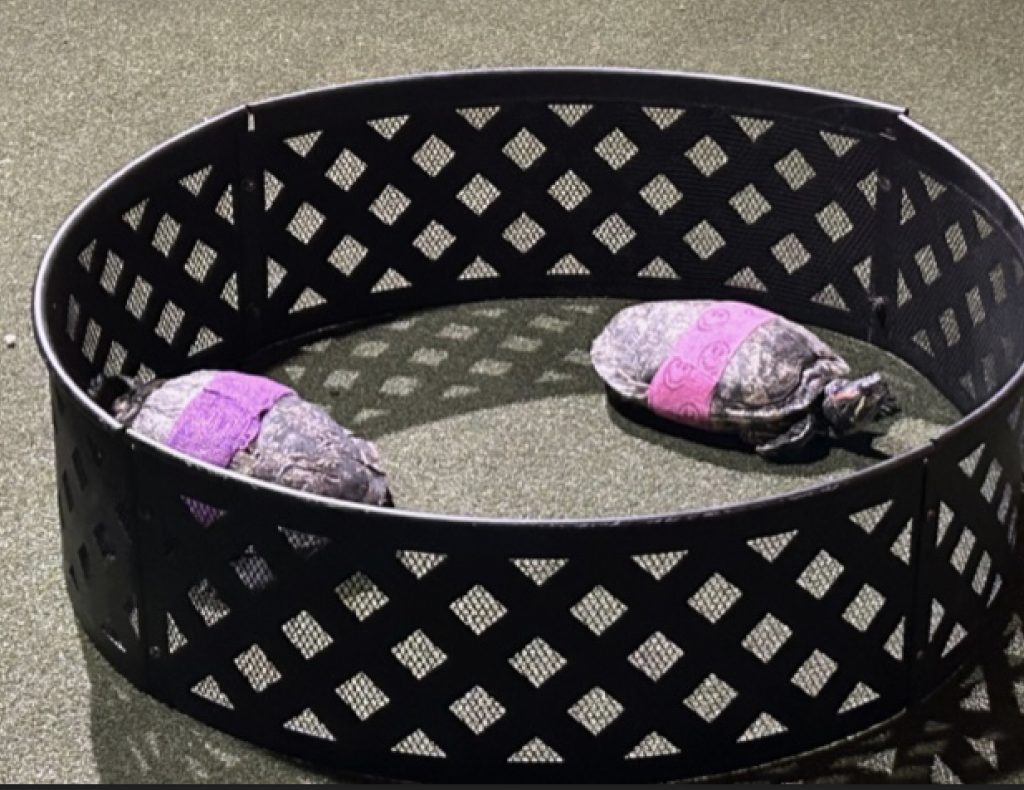 Turtles in a pen in the middle of the floor while patrons scream and yell.