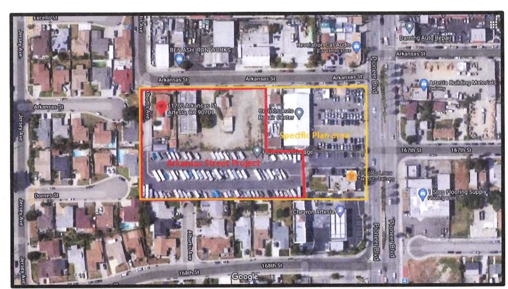 THE AREA (inside red line) where Eginhouse will be built. Pioneer Blvd. in on the right and Arkansas St. is immediately above the top red line.