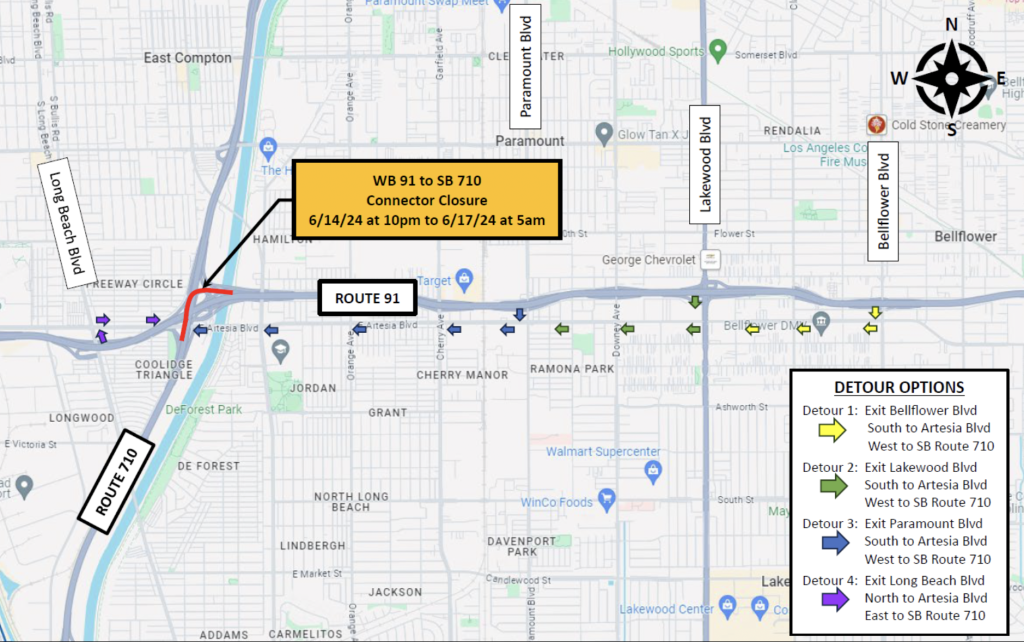 LONG BEACH — The California Department of Transportation (Caltrans) announces a 55-hour extended weekend closure of the westbound SR-91 to southbound I-710 connector in Long Beach. The closure will allow crews to safely repair concrete on portions of the bridge deck.