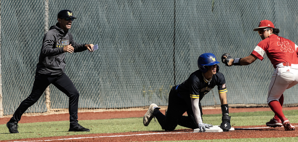 La Mirada High junior shortstop Aiden Aguayo is safe at third after a botched pickoff attempt in the top of the first inning against Orange Lutheran High last Saturday in the championship game of the CIF Southern California Division I Regionals. Aguayo had reached on an error and scored La Mirada’s second run of the inning. PHOTO BY JIM McCORMACK.