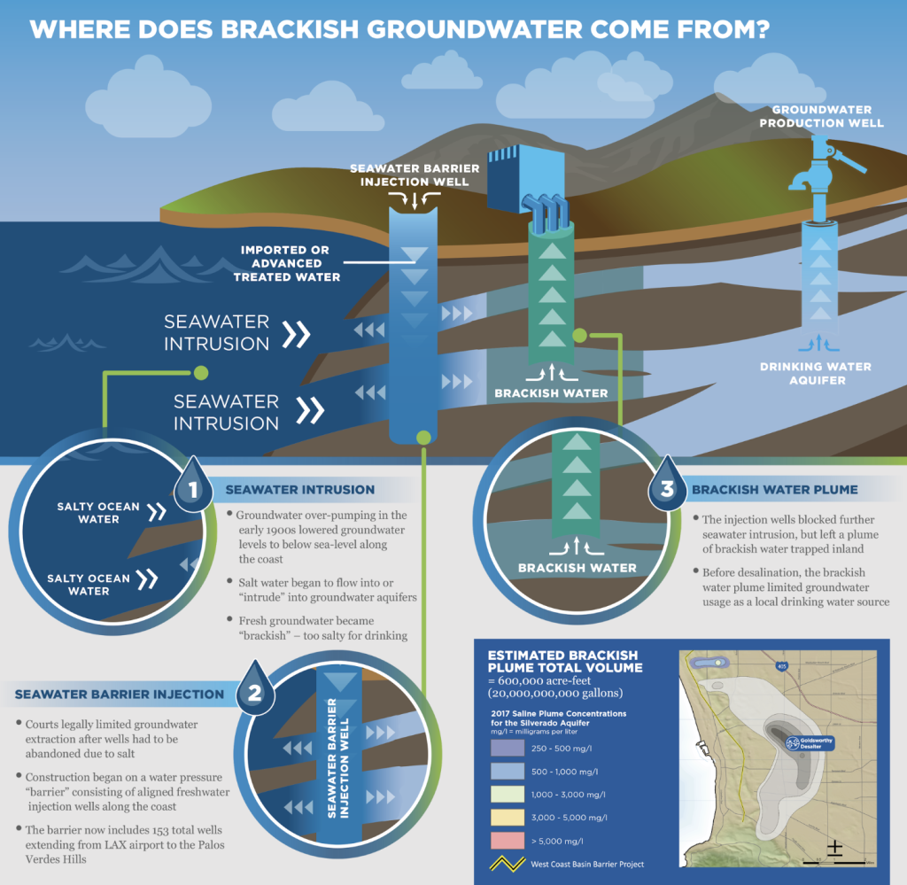 The saline plume located under the South Bay is the result of the over-extraction of groundwater in the early 1900s. This caused seawater to intrude into the groundwater basin where it mixed with freshwater; making that groundwater too salty to be used. The expansion will create a new source of clean drinking water for the region.