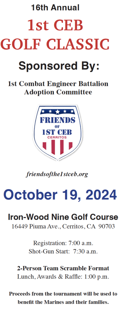 The City of Cerritos adopted the 1st Combat Engineer Battalion (CEB) of the U.S. Marine Corps on Nov. 11, 2007 to raise funds for the Marines and their families via Wounded Warrior Support; Bereavement; Welcome Home Bags; Support for Battalion Events (Beach Bash, Halloween, Christmas Party); Wreath for Cerritos Memorial Day & Veterans Day Ceremonies / 1st CEB Participation; Super Breed Specials (2 per month); Restaurant gift cards for a 1st CEB single Marines – selected by their unit – and a guest and purchase of equipment and furniture for the TF Sapper (MPR) at Camp Pendleton. This area will benefit the Marines by creating a space for them to relax and socialize on their time off.
