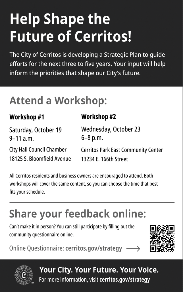The City of Cerritos is developing a Strategic Plan to guide efforts for the next three to five years. Cerritos residents input will help inform the priorities that shape the City’s future.