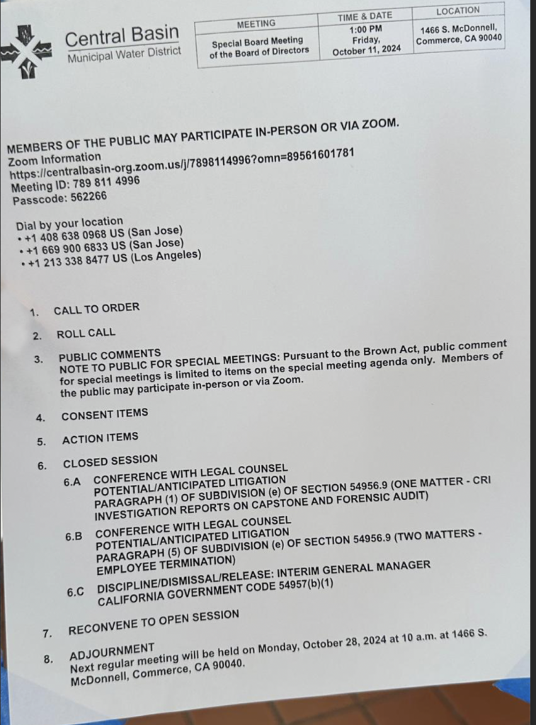 Earlier this week, the President of the Central Basin Board of Directors requested a special board meeting for Friday, October 11, 2024. I regret to inform you that one of the agenda items for Friday is the release of the Interim General Manager.”