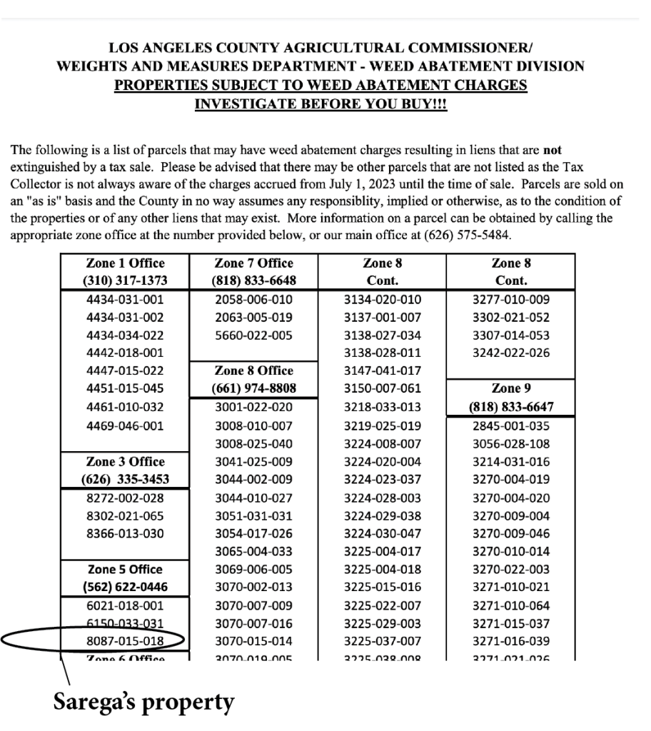 The last part of the notice read, “The real property that is subject to this notice is situated in the County of Los Angeles, State of California, and is described as follows: PUBLIC AUCTION NOTICE OF SALE OF TAX-DEFAULTED PROPERTY SUBJECT TO THE POWER OF SALE AIN 8087-015-018 SAREGA, ION AND ANETA, $8,163.00.”