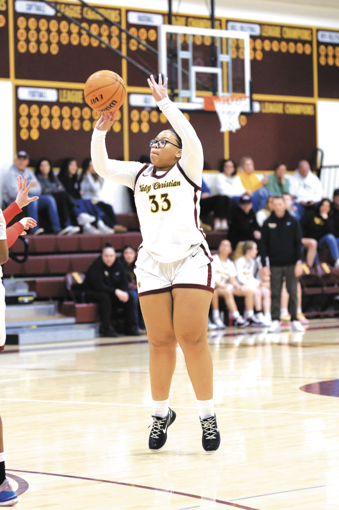 Valley Christian High senior Chayse Chambers takes one of her 11 shots from beyond the three-point line last Friday against Maranatha High in the Olympic League opener. Chambers hit six three-pointers, accounting for all 18 points she scored as the Defenders rallied in the second half for a 44-33 victory. PHOTOS BY STEVE FERICEAN.