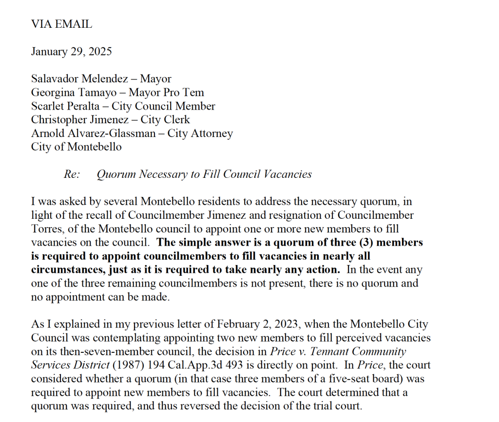 A letter obtained by Los Cerritos Community News dated January 29, 2025 from the law firm of Shenkman and Hughes warned Montebello Mayor Melendez, Mayor Pro Tem Tamayo, and Councilmember Peralta that a quorum is three members “to fill vacancies in nearly all circumstances just as it is required to take nearly any action.”