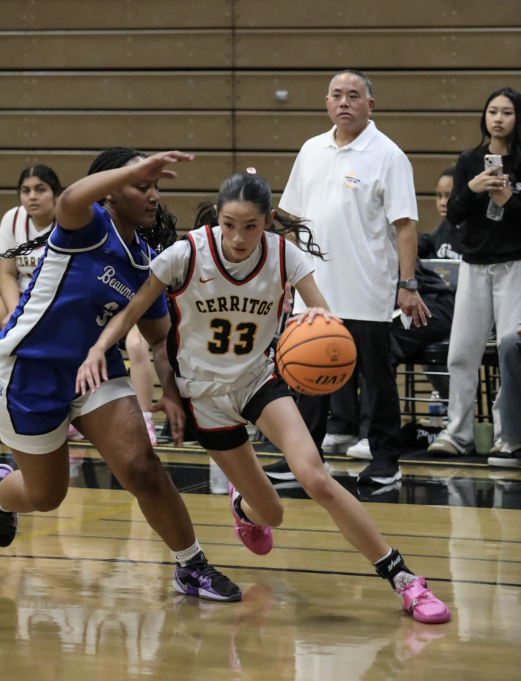 With head coach Marcus Chinen looking on, Cerritos High junior Cameron Lacorte drives around Amirah Jones of Beaumont High in last Saturday’s CIF-Southern Section Division 3AA second round game. Lacorte scored 19 points and was seven of 15 from the field, including five three-pointers as the Dons took care of Beaumont 68-51. PHOTO BY JASON WATANABE.