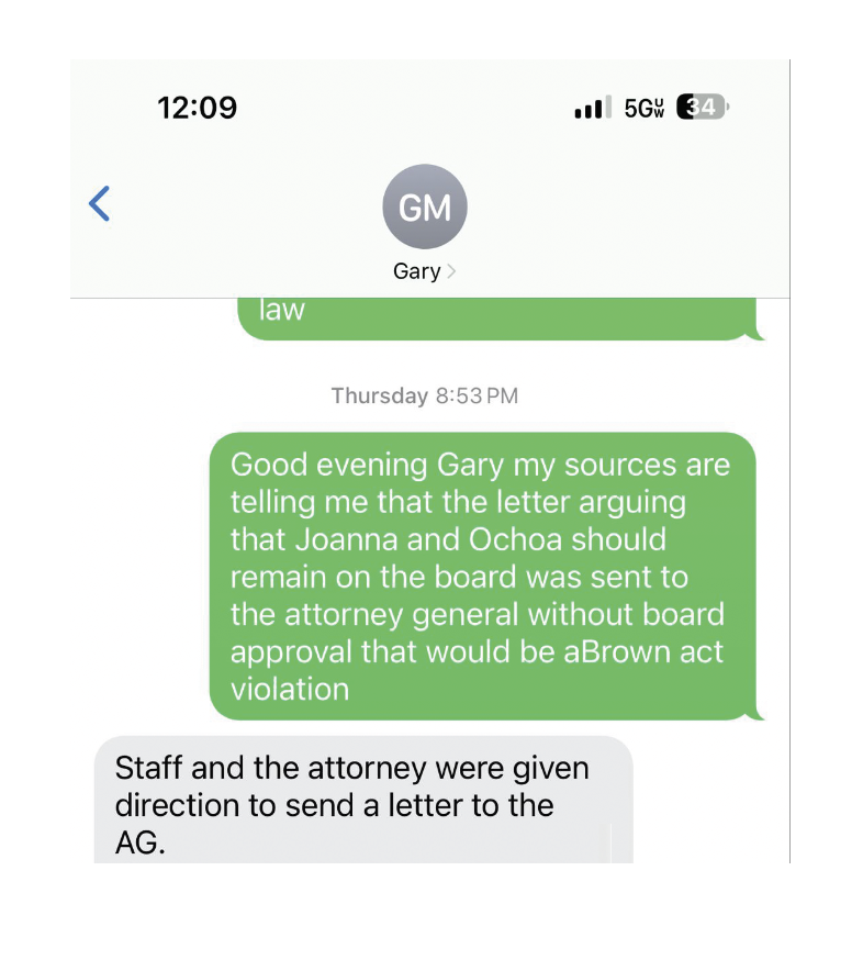 The letter argues that they should remain on the board. The two were at the meeting that “provided direction.” In any other public agency meeting, directors in that situation would have recused themselves from any discussion, which would leave only Director Juan Garza and VP Gary Mendez (two out of seven) as the officials who “provided direction.”