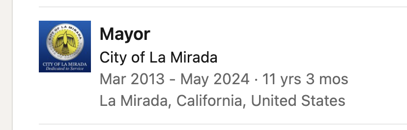 Sarega has only been a lawyer for two years. According to sources, his stint at Olivarez, Madruga, was short and very rocky. In researching his employment, LCCN found Sarega lying bald-faced on his LinkedIn account, stating he was Mayor of La Mirada for eleven years from 2013 to 2024.