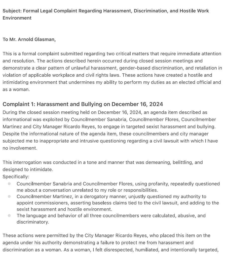 Castillo ended the complaint, writing, “These discriminatory, harassing, and retaliatory actions have caused significant emotional distress.” She then asked for an outside investigation. “I am asking that an independent, unbiased investigation be conducted by a third-party who is hired and overseen by city attorney Arnold Glasman.”