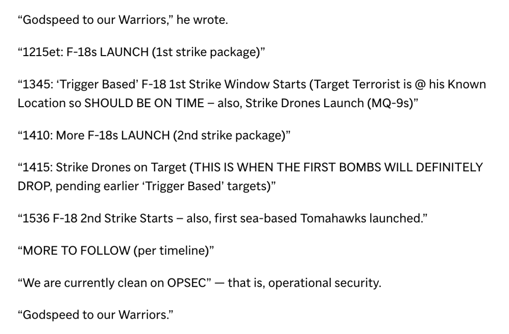 In the group chat, Hegseth posted multiple details about the impending strike, using military language and laying out when a “strike window” starts, where a “target terrorist” was located, the time elements around the attack and when various weapons and aircraft would be used in the strike. He mentioned that the U.S. was “currently clean” on operational security.”