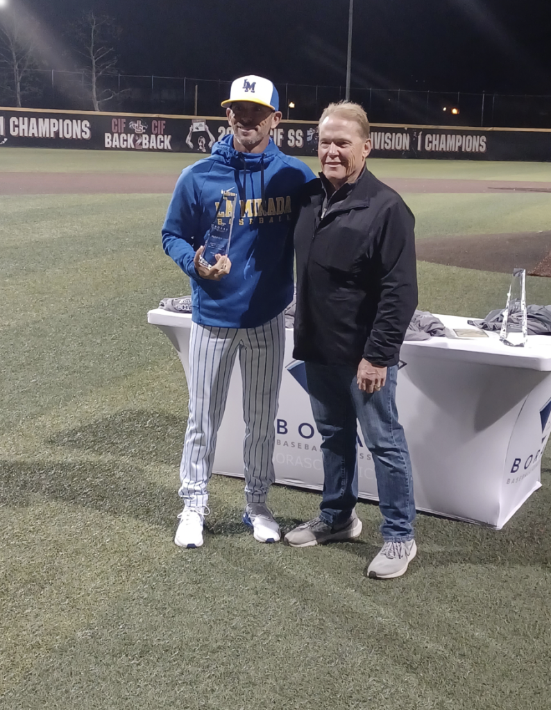 La Mirada High head coach Jimmy Zurn, with Gerry Boras of the Boras Family Foundation, accepts the runner-up trophy from the 13th annual Boras Baseball Classic last Friday night. The Matadores fell to Corona High 8-3 in the championship game. PHOTO BY LOREN KOPFF.