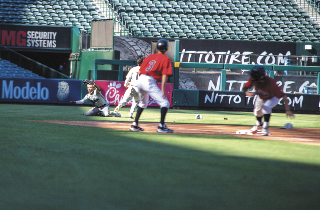 Cerritos High junior left fielder Justin Sagun goes from the sun to the shade to deny Artesia High junior first baseman Adrian Romero of a bases-loaded run-scoring hit in the bottom of the third inning of this past Tuesday’s Halo Classic at Angel Stadium. Cerritos defeated Artesia 3-0 with senior second baseman Dalton Chi clearing the bases with a two-out double in the fifth. Photos by Scott Lake.