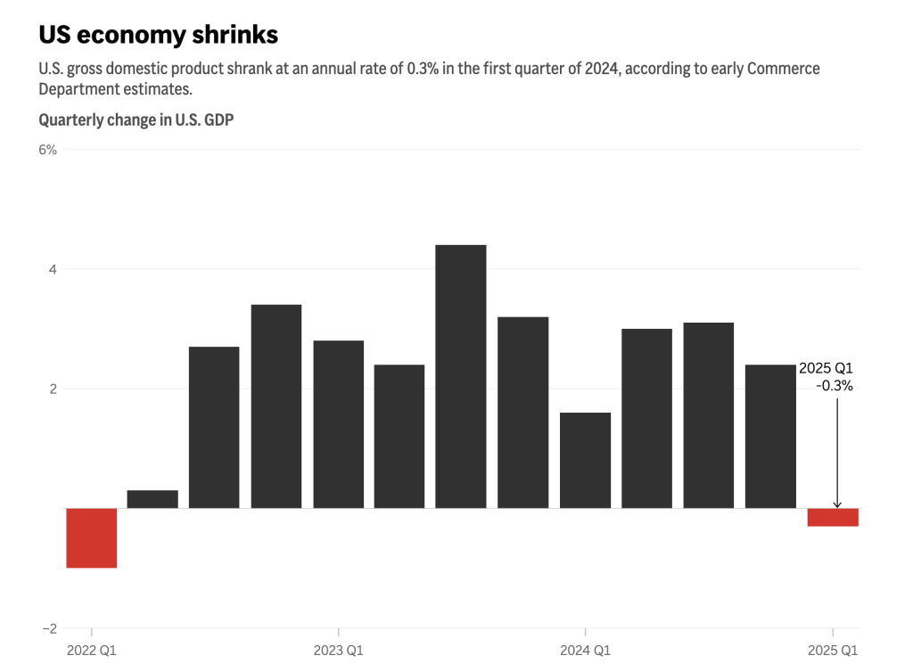 The U.S. economy shrank at a 0.3% annual pace from January through March, the first drop in three years, as President Donald Trump’s trade wars disrupted business. First-quarter growth was slowed by a surge in imports as companies in the United States tried to bring in foreign goods before Trump imposed massive tariffs.