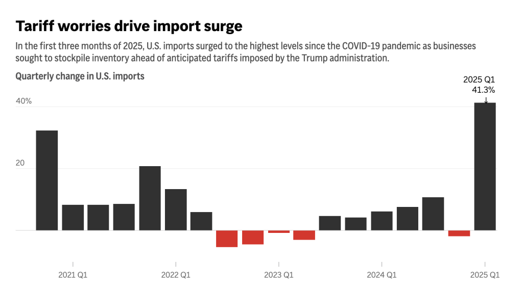 The January-March drop in gross domestic product — the nation’s output of goods and services — reversed a 2.4% gain in the last three months of 2024. Imports grew at a 41% pace, fastest since 2020, and shaved 5 percentage points off first-quarter growth. Consumer spending also slowed sharply — to 1.8% growth from 4% in October-December last year. Federal government spending plunged 5.1% in the first quarter.