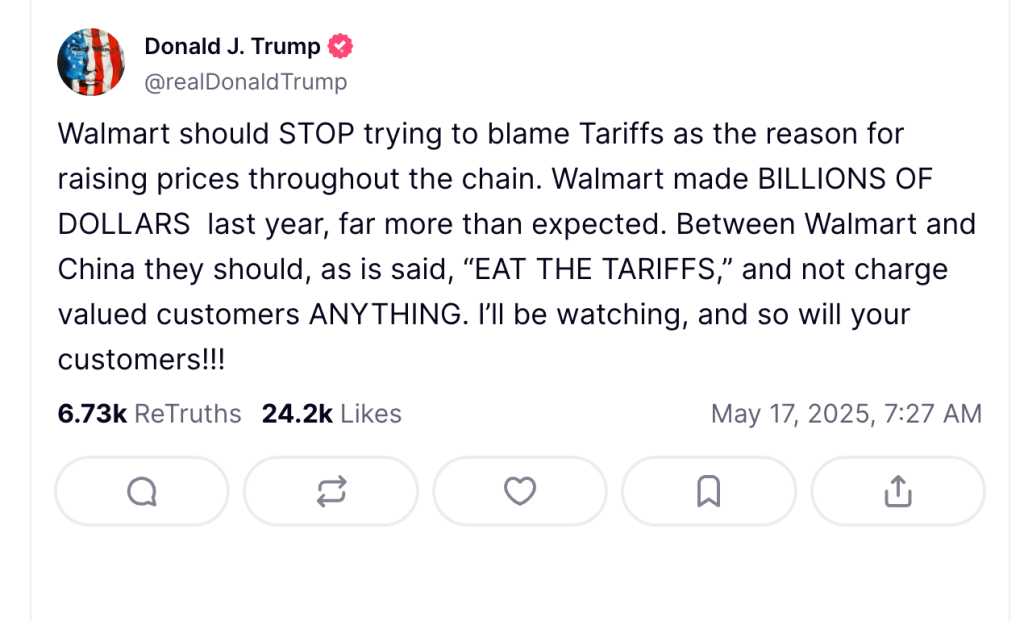 “Walmart should STOP trying to blame Tariffs as the reason for raising prices throughout the chain,” Trump wrote on Truth Social. “Between Walmart and China they should, as is said, “EAT THE TARIFFS,” and not charge valued customers ANYTHING. “I’ll be watching, and so will your customers!!!”