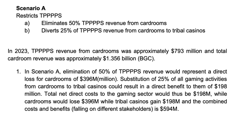 Additionally, the math throughout the report is sketchy. The SRIA is packed with what it refers to as “conservative assumptions.” There’s no empirical backing for the expected behavior of gamblers, the revenue substitution claims, or the idea that cardrooms can easily pivot to different games. Even the authors admit these numbers are just “illustrative” (page 13).