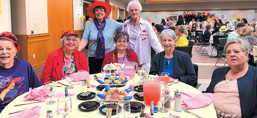 The popular Friendship and Early Mothers’ Day event at the Cerritos Senior Center sold out quickly (as usual) this year but the local Red Hat group was able to reserve a table. The event is a great deal: for only $15 each, attendees received a catered luncheon of croissant turkey sandwiches, fresh fruit, potato salad, brownie desserts and an assortment of hot and cold beverages. The tables were decorated tastefully with mini gifts for everyone.