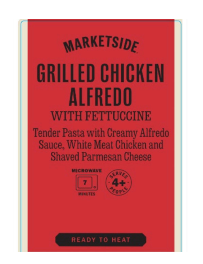 - 32.8-oz. tray packages containing “MARKETSIDE GRILLED CHICKEN ALFREDO WITH FETTUCCINE Tender Pasta with Creamy Alfredo Sauce, White Meat Chicken and Shaved Parmesan Cheese” with best-by date 06/27/25 or prior.